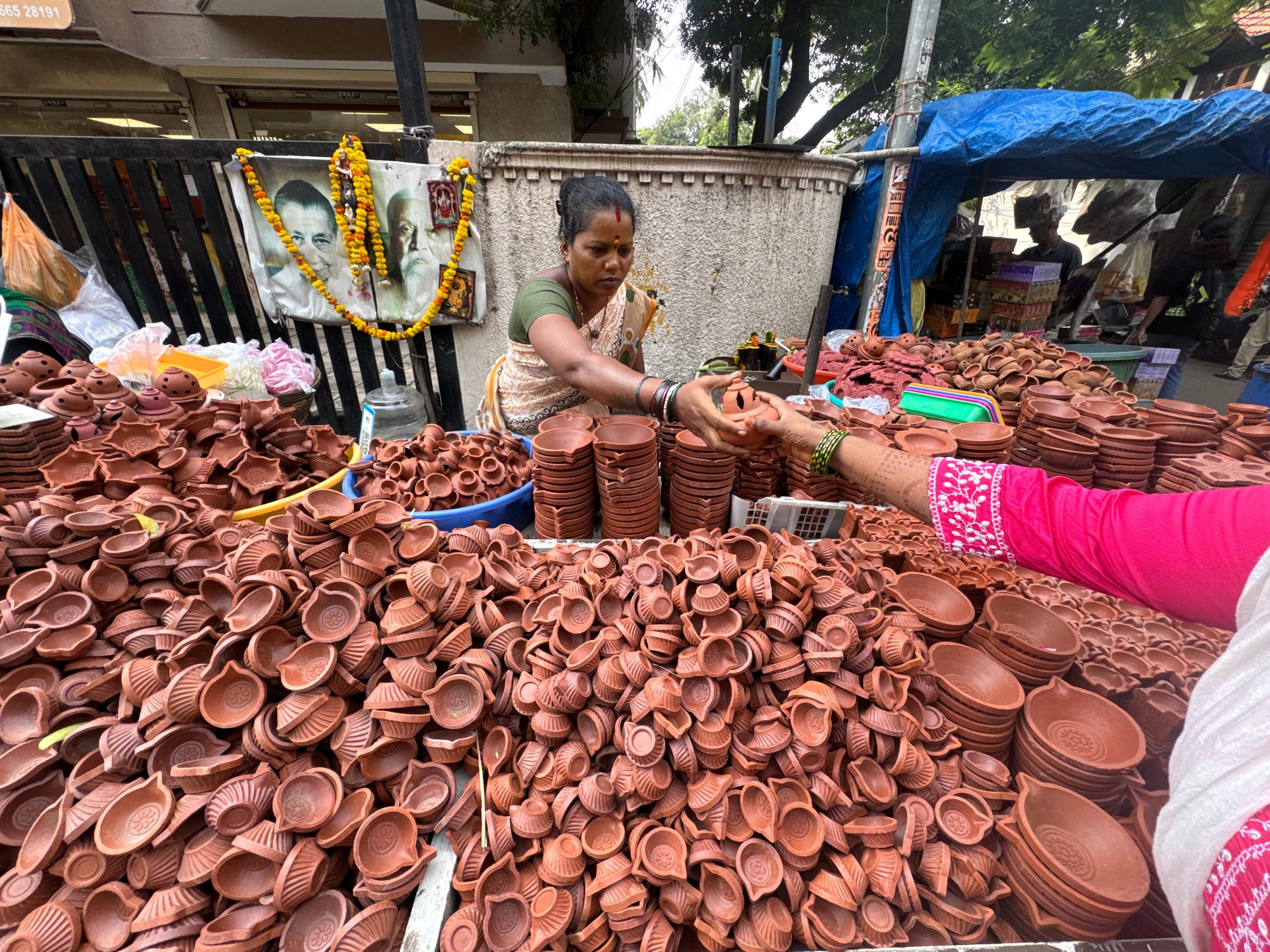 இந்த வாரம், சாய்பாபா கோயிலுக்கு அருகில் இருக்கும் ஒரு வியாபாரி அவர் கடையில் பலவிதமான அகல் விளக்குகளின் குவியல்களைக் காட்சிப்படுத்தியுள்ளார்.